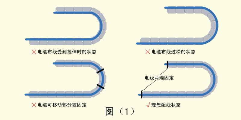 2、如果電纜在布線時(shí)愛到張力拉伸,會(huì)與拖鏈內(nèi)壁產(chǎn)生摩擦導(dǎo)致護(hù)套磨損。反之如果布線過于松散,同樣會(huì)與拖鏈的內(nèi)壁產(chǎn)生摩擦造成護(hù)套磨損,并且容易與其他電纜產(chǎn)生纏繞現(xiàn)象。電纜的布線長度應(yīng)設(shè)定在剛好能通過拖鏈的中心線宜。電纜的移動(dòng)部分如果被固定,會(huì)導(dǎo)致彎曲應(yīng)力無法被分散和吸收,會(huì)在固定位置造成應(yīng)力集中。電纜的固定部分應(yīng)設(shè)置在拖鏈的兩端。如圖(1)