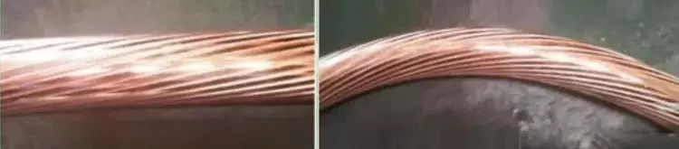彎曲對導(dǎo)體的影響:電纜導(dǎo)體由多根單芯導(dǎo)線以一定節(jié)距絞合而成,在導(dǎo)體制作過程中導(dǎo)體的單線根數(shù)和節(jié)距大小決定了導(dǎo)體彎曲時的穩(wěn)定性,過大的彎曲將導(dǎo)致導(dǎo)體的松散和突起,直接影響導(dǎo)體外層半導(dǎo)電層和絕緣層的性能。