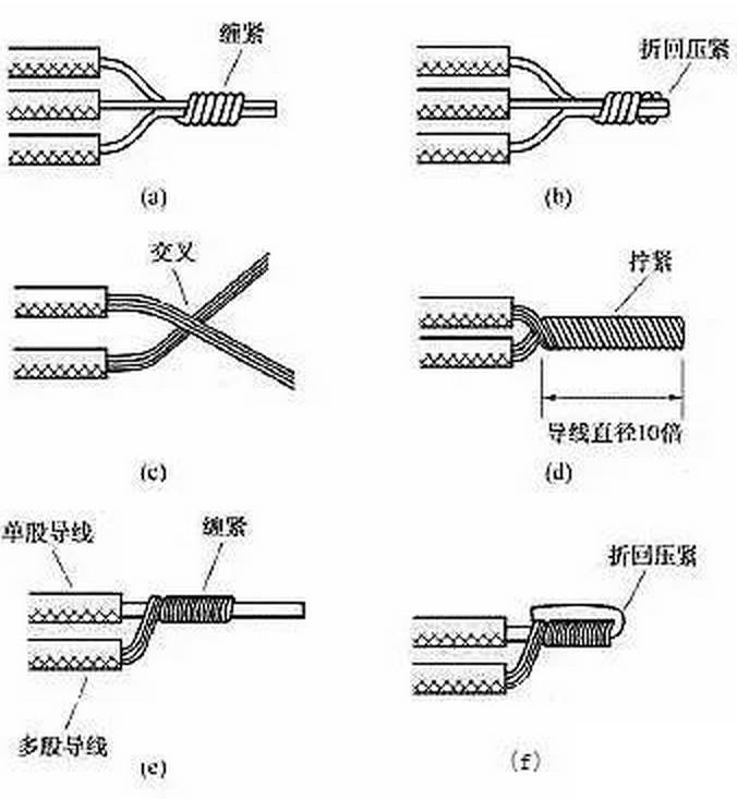 (6)同一方向的導(dǎo)線的連接。當(dāng)需要連接的導(dǎo)線來自同一方向時(shí),可以采用圖10所示的方法。對(duì)于單股導(dǎo)線,可將一根導(dǎo)線的芯線緊密纏繞在其他導(dǎo)線的芯線上,再將其他芯線的線頭折回壓緊即可。對(duì)于多股導(dǎo)線,可將兩根導(dǎo)線的芯線互相交叉,然后絞合擰緊即可。對(duì)于單股導(dǎo)線與多股導(dǎo)線的連接,可將多股導(dǎo)線的芯線緊密纏繞在單股導(dǎo)線的芯線上,再將單股芯線的線頭折回壓緊即可。